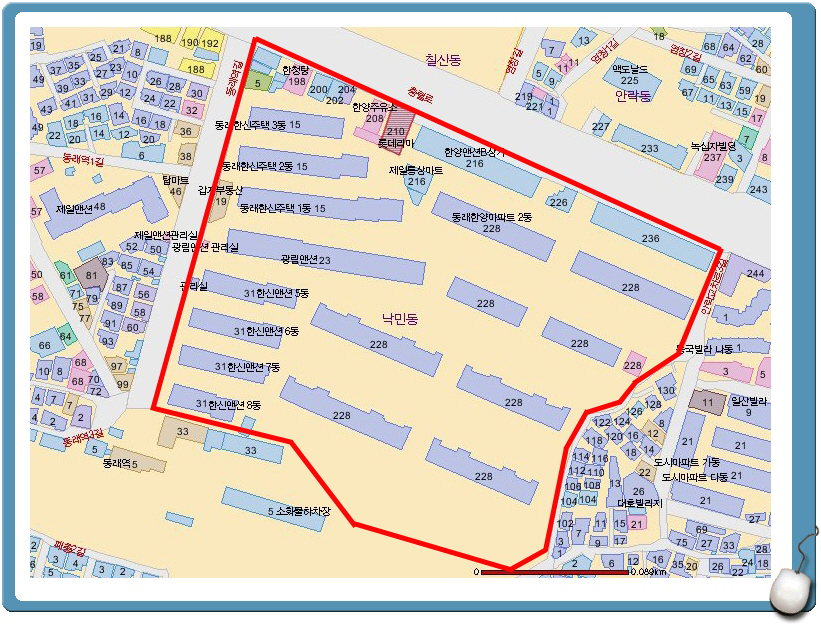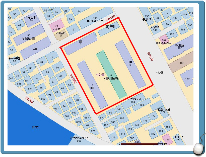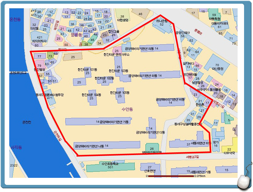 | 위치 | 수안동 665번지 일원 (새동래,산호,한전,성림,삼부,장미,대진,수안,무궁화) |