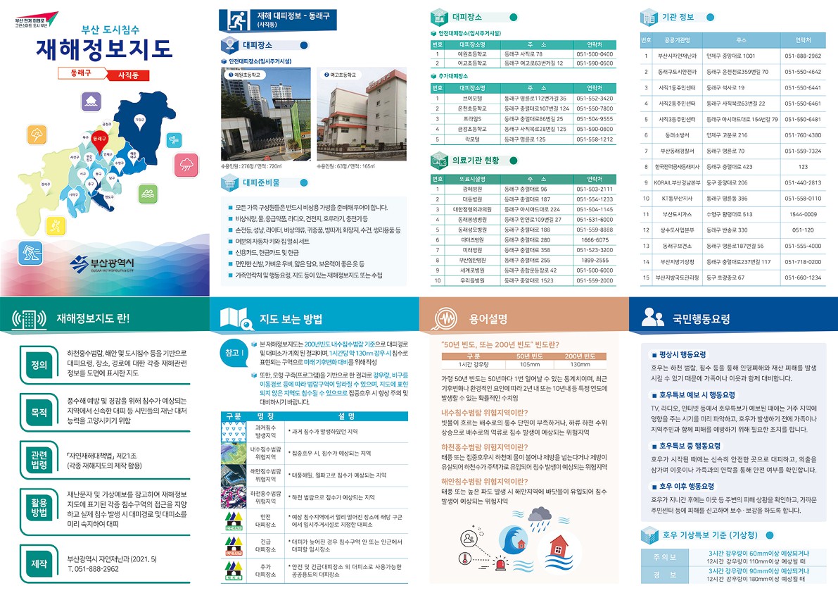 | 자연재난행동요령 | 태풍, 호우, 낙뢰, 강풍, 대설, 한파, 폭염, 황사, 지진, 해일, 화산폭발, 가뭄, 홍수, 미세먼지 등 |