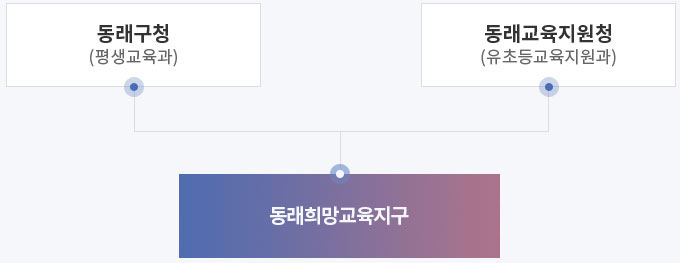 동래희망교육지구 동래희망교육지구는 마을과 학교를 연결하는 허브로서 마을이 삶터, 배움터, 놀이터의 공간이 되도록 지역의 교육환경을 구성해 나가는 곳입니다. 조직도 오시는길 부산 동래구 충렬대로237번길 93(동래구청 6층, 평생교육과) 051-550-4474~6 길찾기