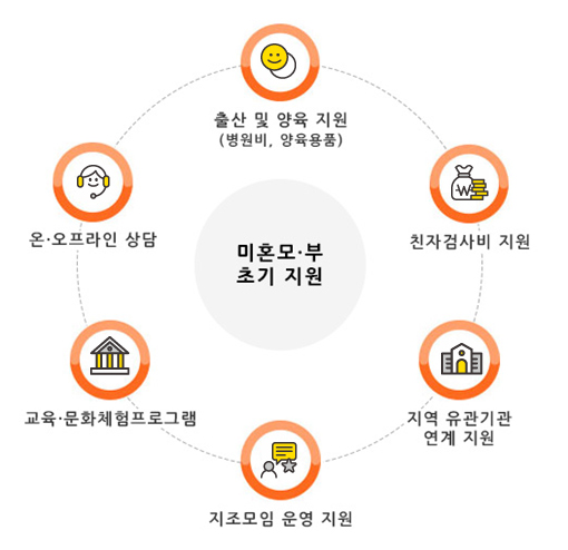 - 미혼모·부에게 자녀출산과 양육 시 응급지원을 제공하며, 상담과 자조모임의 방법으로 아동 양육은 물론 자립에 이르도록 지원